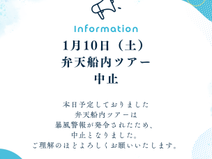 本日開催を予定しておりましたキッズクルーズ船「弁天」船内ツアーは、暴風警報発令に伴い、お客様の安全を最優先し中止とさせていただきます。 楽しみにしてくださっていた皆さまには、誠に申し訳ございません。 何卒ご理解のほど、よ […]