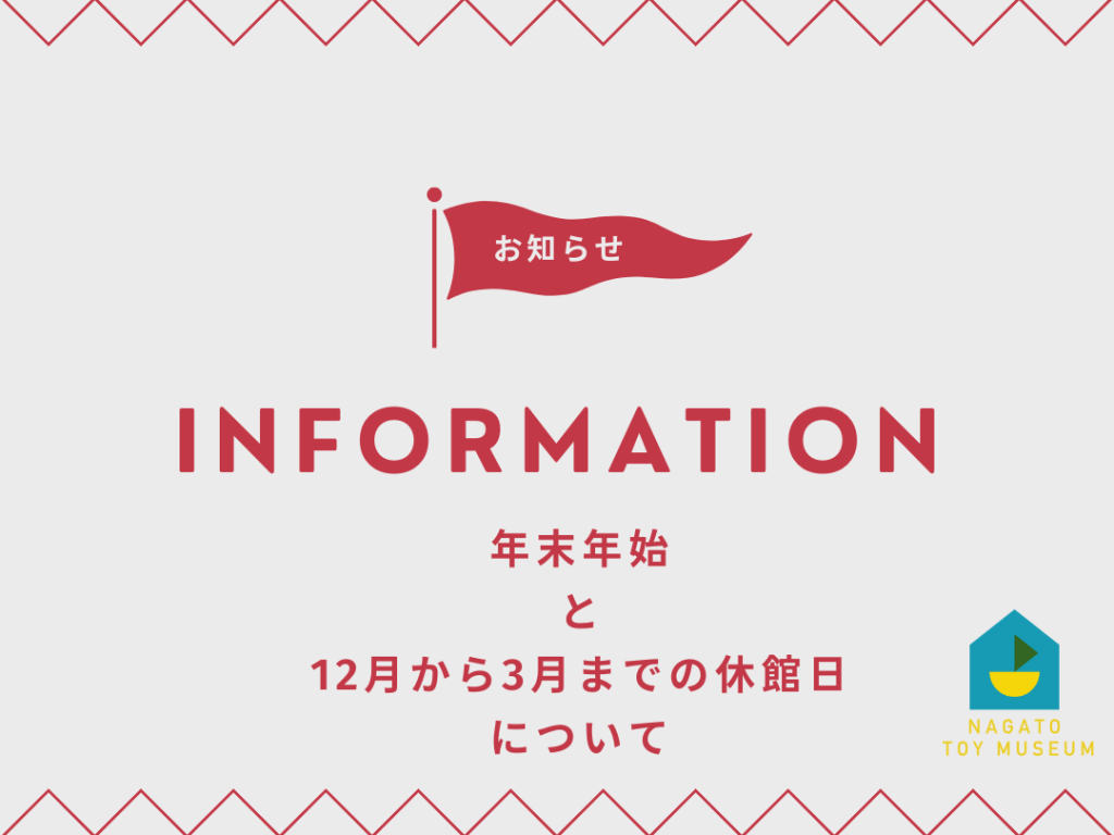 長門おもちゃ美術館は12月から3月までの間、水曜日と木曜日を休館日とさせていただきます。(祝日(建国記念の日:2月11日(水))と冬休み(12月25日(木))・春休み期間は休みなく開館予定)